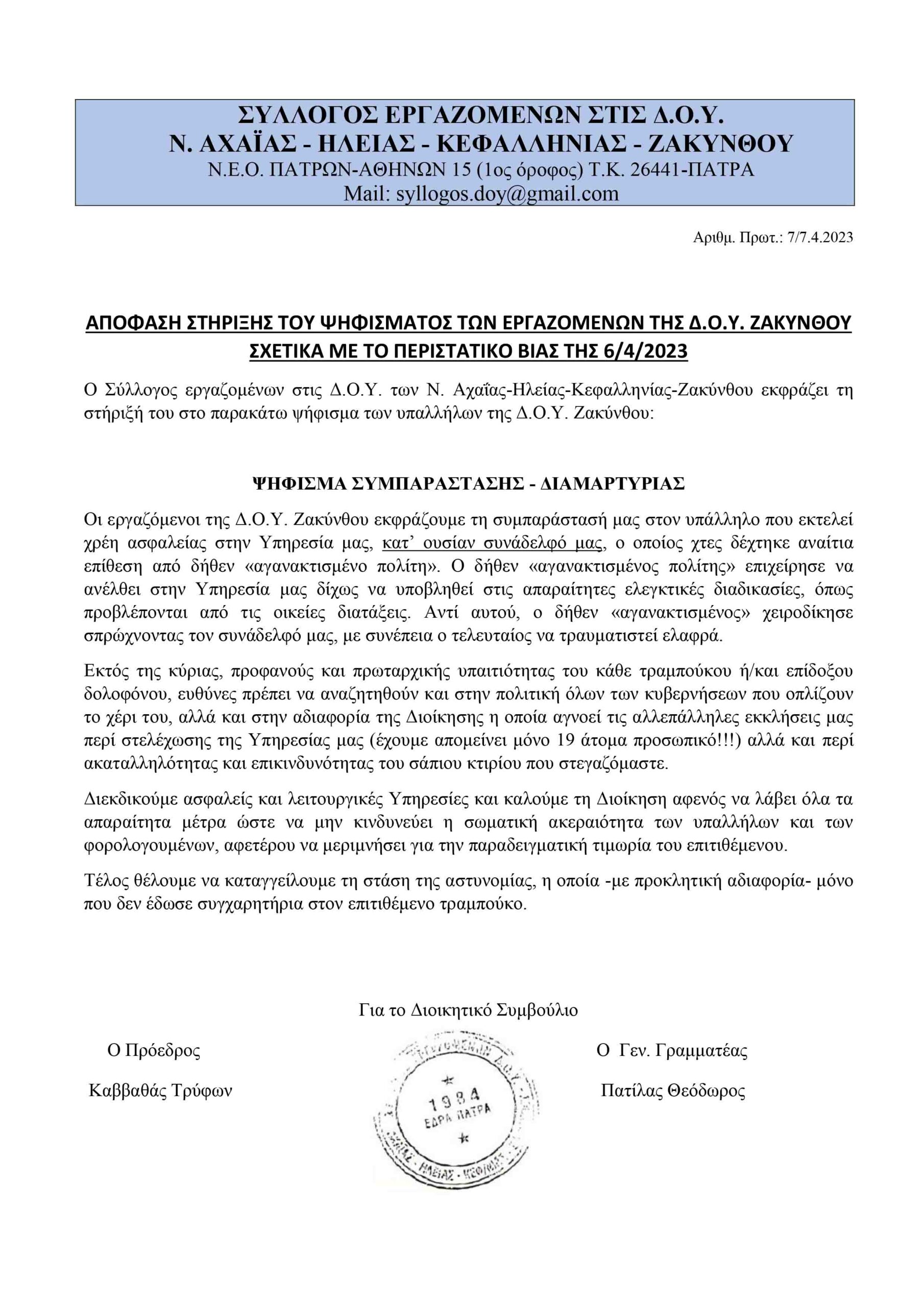 Σύλλογος Εργαζομένων στις Δ.Ο.Υ Ν. Αχαΐας-Ηλείας-Κεφαλληνίας-Ζακύνθου: Σχετικά με περιστατικό βίας στη Δ.Ο.Υ Ζακύνθου στις 6.4.2023