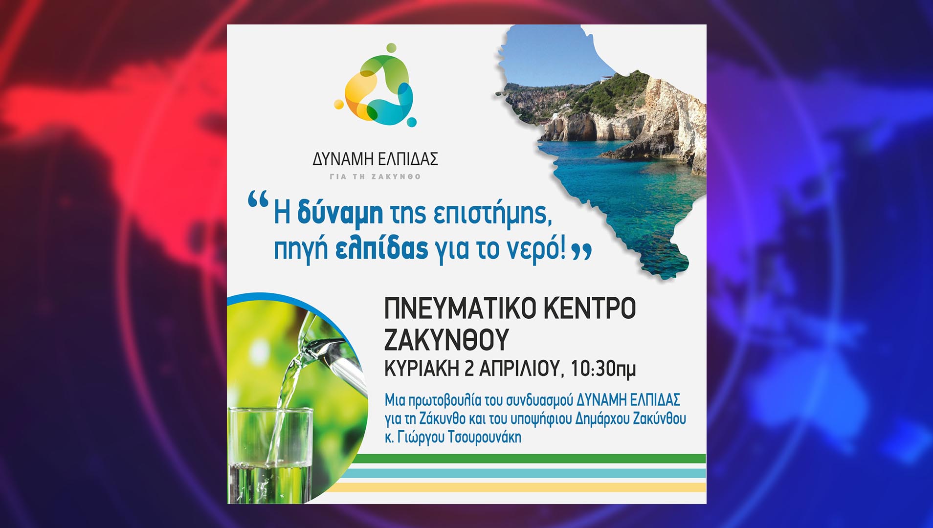 «Ως ΔΥΝΑΜΗ ΕΛΠΙΔΑΣ, έχουμε στα χέρια μας ειδική μελέτη από υδρογεωλόγους, που εξέτασαν τα δεδομένα της Ζακύνθου και κατέγραψαν τις προτάσεις τους για την οριστική λύση του προβλήματος του νερού. Θα σας την παρουσιάσουμε 2 Απριλίου, 10.30, στο Πνευματικό Κέντρο Ζακύνθου. Για να δώσουμε τέλος στο μαρτύριο της σταγόνας για τους Ζακυνθινούς».