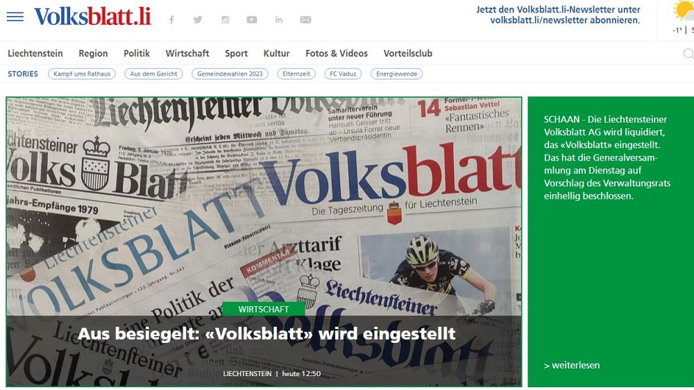 Η παλαιότερη εφημερίδα του Λιχτενστάιν, που πρωτοκυκλοφόρησε πριν από 145 χρόνια, βάζει λουκέτο, θύμα και αυτή της μείωσης των διαφημίσεων και των συνδρομών.
