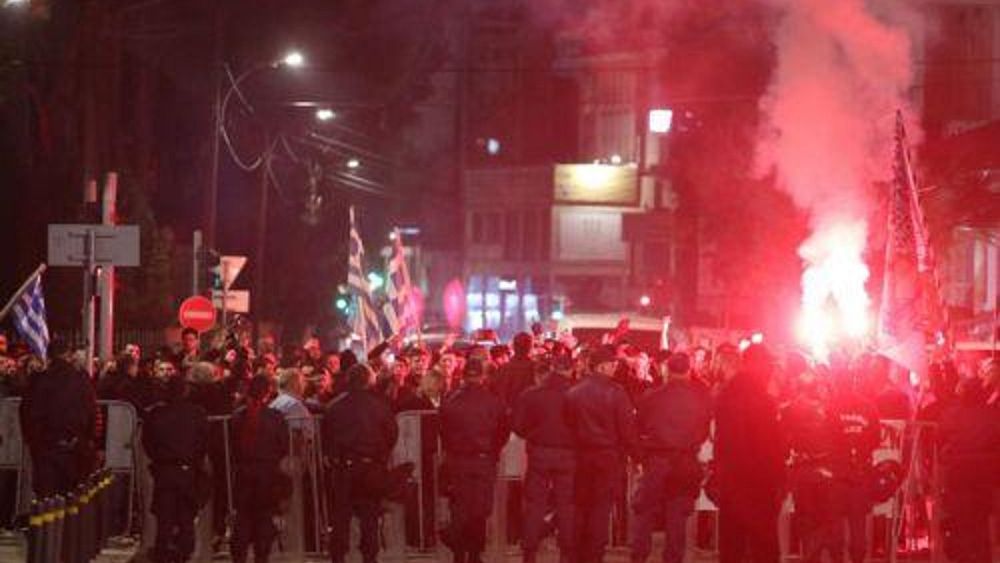Οι διαμαρτυρόμενοι προς το τέλος της εκδήλωσης άναψαν φωτοβολίδες και έψαλλαν τον Εθνικό Ύμνο.