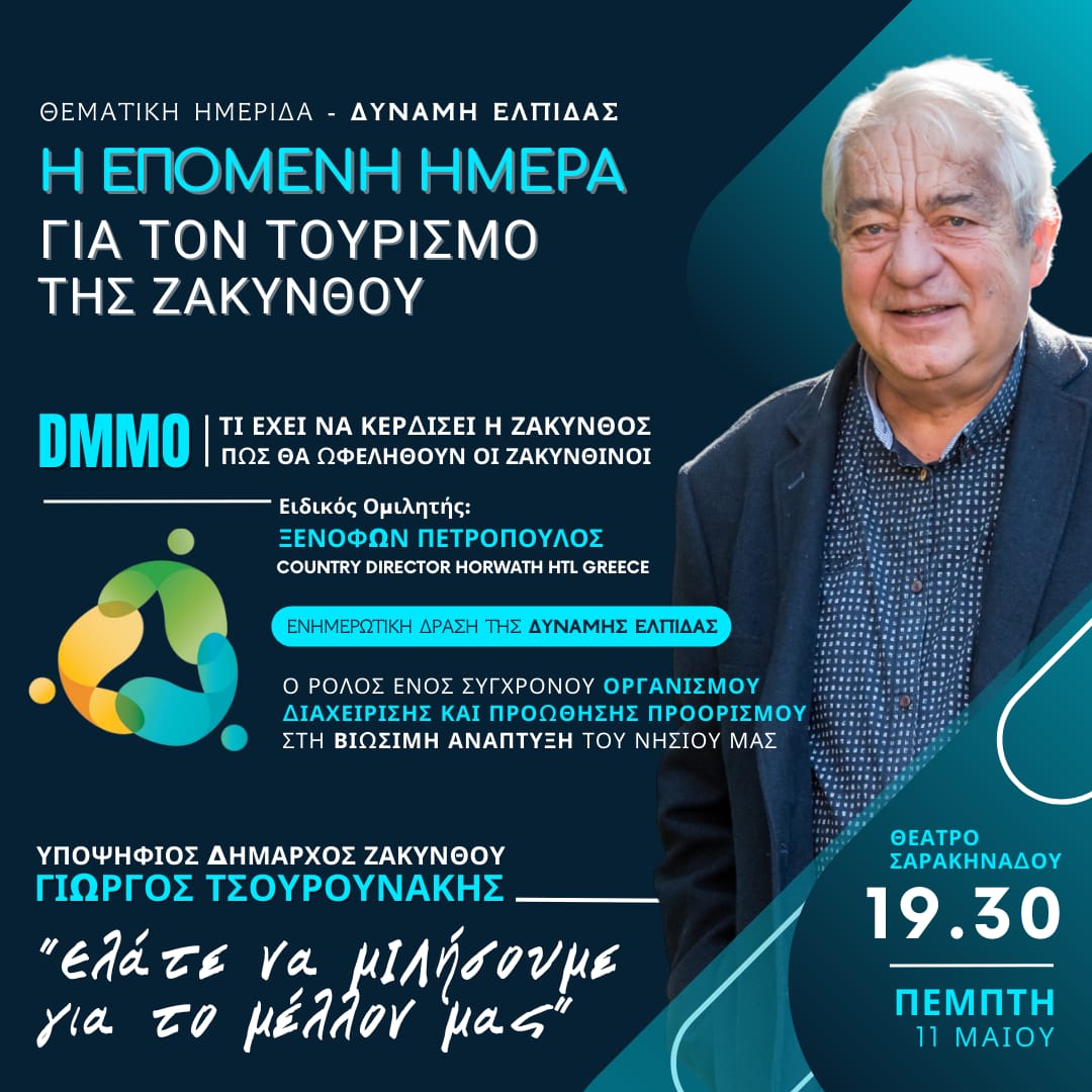 Την Πέμπτη, 11 Μαΐου, στις 19.30 το απόγευμα, στο Θέατρο Σαρακηνάδου, ο συνδυασμός «Δύναμη Ελπίδας για τη Ζάκυνθο», με επικεφαλής τον Γιώργο Τσουρουνάκη, διοργανώνει ειδική ενημερωτική ημερίδα για τη διαχείριση της επόμενης μέρας στον τουρισμό, κατά την οποία ο Ξενοφών Πετρόπουλος (country director, Ηοrwarth HTL Greece) θα παρουσιάσει τον καίριο ρόλο που μπορεί να διαδραματίσει στην προώθηση και ανάπτυξη του τουριστικού προϊόντος της Ζακύνθου ένας σύγχρονος Οργανισμός Διαχείρισης και Προώθησης Προορισμού (DMMO).