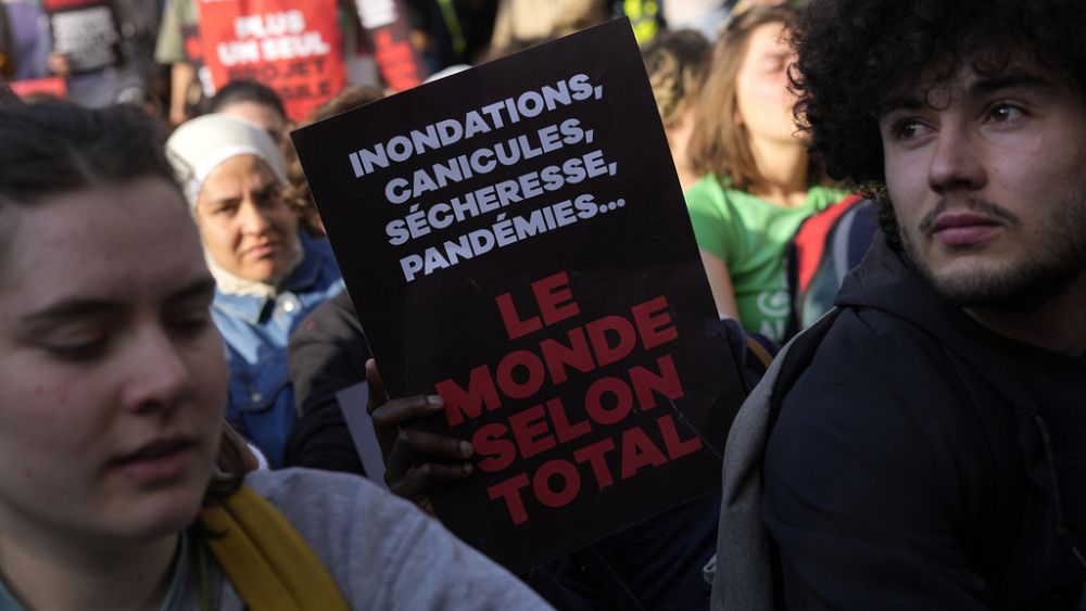 «Η επιστήμη είναι σαφής όμως η Total την αγνοεί», ανέφερε πανό που κρατούσαν οι διαδηλωτές, ανάμεσα στους οποίους και ακτιβιστές της Greenpeace.