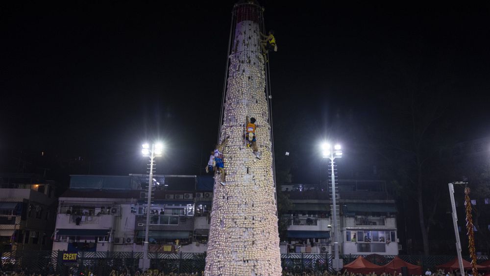 Ορειβάτες σκαρφαλώνουν σε έναν πύργο από μπαμπού ύψους 14 μέτρων, ο οποίος είναι καλυμμένος με μικρά ψωμάκια και κουλούρια.
