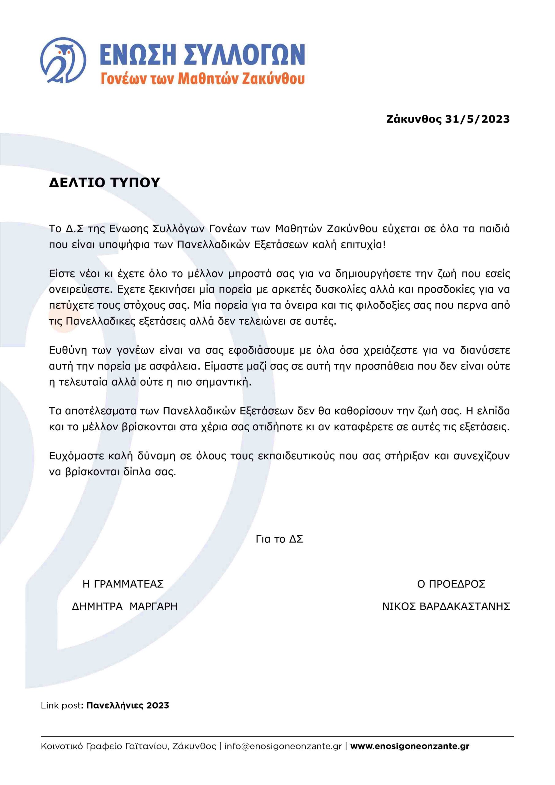 Ένωση Συλλόγων Γονέων των Μαθητών Ζακύνθου: Εύχεται σε όλα τα παιδιά που είναι υποψήφια των Πανελλαδικών Εξετάσεων καλή επιτυχία! Post author By Impartial Press Bot Post date June 1, 2023 Categories In ΖΑΚΥΝΘΟΣ The post Ένωση Συλλόγων Γονέων των Μαθητών Ζακύνθου: Εύχεται σε όλα τα παιδιά που είναι υποψήφια των Πανελλαδικών Εξετάσεων καλή επιτυχία! appeared first on ZANTETIMES.GR.