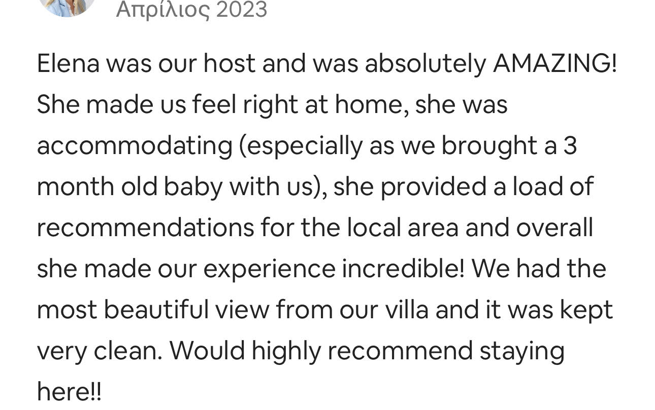 Πολύ σημαντικό είναι για το πελάτη η 24/7 δυνατότητα επικοινωνίας απευθείας με την hostess τους. Χωρίς υπερβολές είμαι το πρώτο και τελευταίο τηλέφωνο στις διακοπές τους, κάνοντας τους έτσι να νιώθουν άνετα και ασφαλείς σε μια ξένη χώρα.