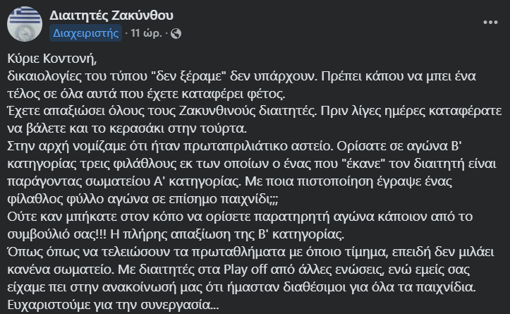 Η δεύτερη ανακοίνωση ανεβάζει ακόμη περισσότερο τους τόνους, με τον Σύνδεσμο να στρέφεται προσωπικά κατά του υπευθύνου της Ένωσης, κ. Κοντονή. «Δικαιολογίες του τύπου “δεν ξέραμε” δεν υπάρχουν», αναφέρεται με νόημα, ενώ γίνεται λόγος για πλήρη απαξίωση του ρόλου των Ζακυνθινών διαιτητών στη φετινή ποδοσφαιρική περίοδο.